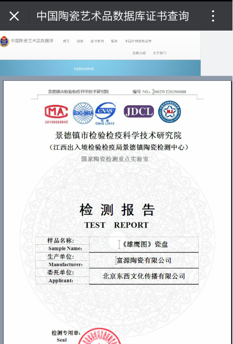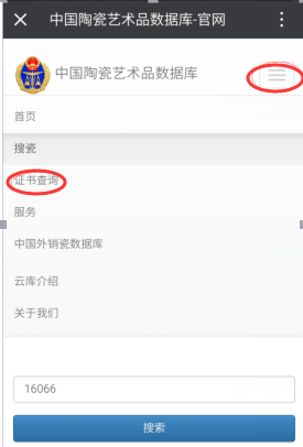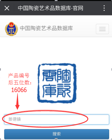 2、進(jìn)入中國陶瓷藝術(shù)品數(shù)據(jù)庫官網(wǎng)頁面,在圖二的選中區(qū)域輸入圖一中產(chǎn)品編號后五位數(shù)字“16066”,即可檢索到該編號產(chǎn)品可供對外查詢信息(每個產(chǎn)品對外可查詢一個體視顯微鏡照片數(shù)據(jù))