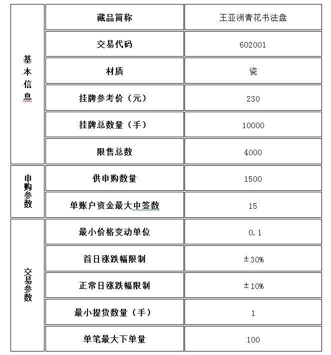 經景德鎮陶瓷交易所有限公司(以下稱本交易所)發行會員申請,本交易所專家委員會、新藏品掛牌審核小組評估審核通過,對已經完成托管入庫的藏品《王亞洲青花書法盤》準予在本交易所線上實物交易系統正式掛牌交易,具體事項公告如下: