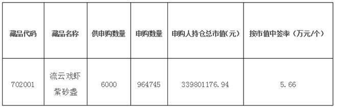 本次中簽分配方式按持倉市值搖號中簽,請廣大參與申購的投資會員關注交易賬號中持倉數量和資金變化情況。《流云戲蝦紫砂盞》將于2017年1月19日正式掛牌交易。